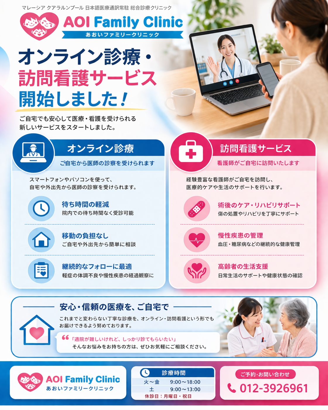 当クリニックでは、患者様の利便性向上を目的として、2026年4月15日より「オンライン診療」および「訪問看護サービス」を開始いたします。