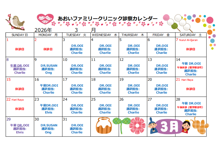 3月の診察日時および担当医師/通訳についてご案内いたします。