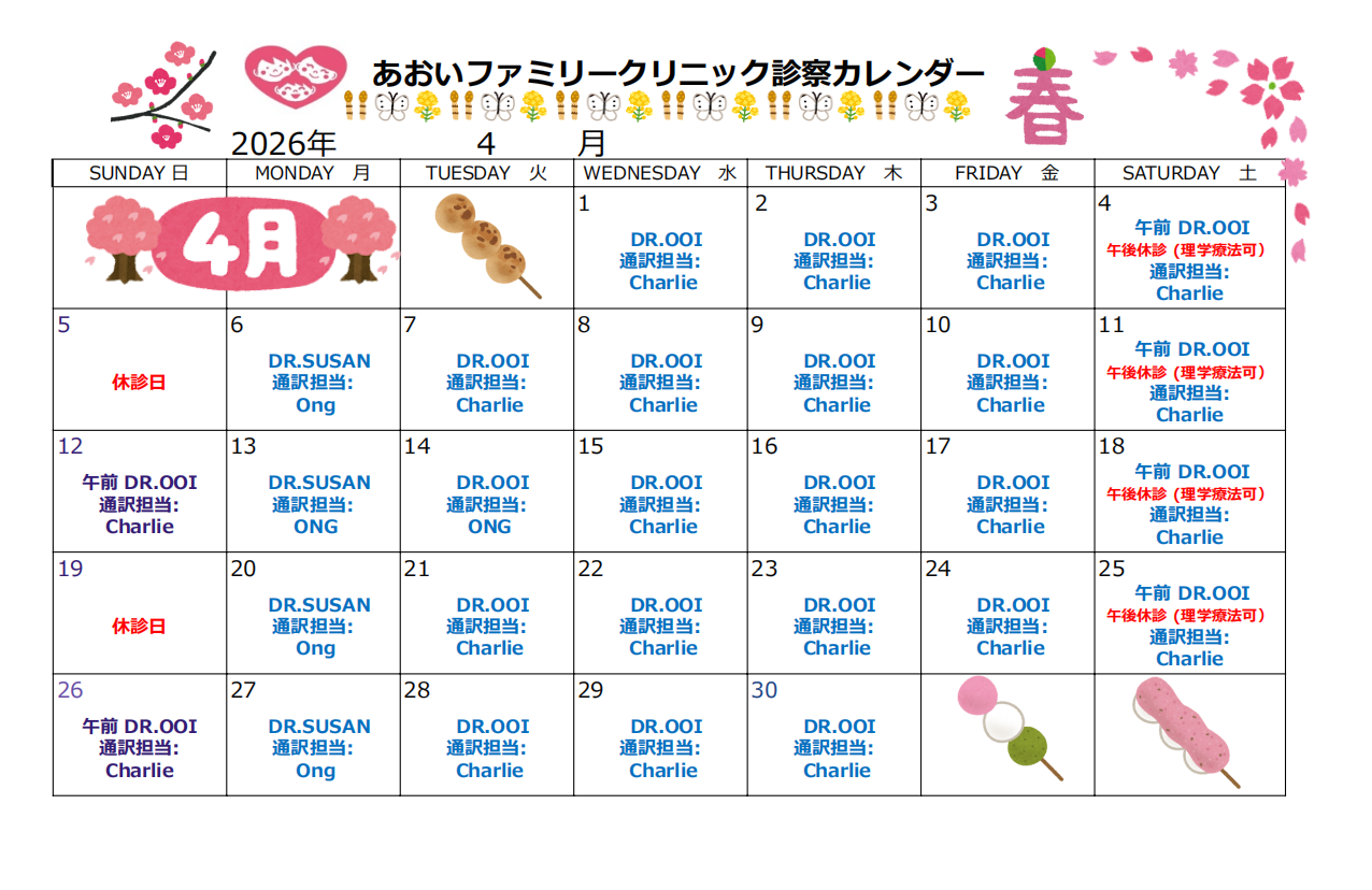 4月の診察日時および担当医師/通訳についてご案内いたします。